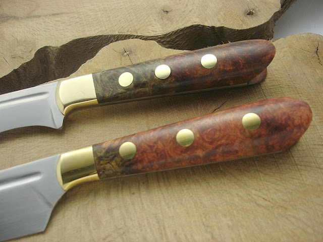 Kukri (aslında yatağan kılıçlarının tipolojisinden esinlenmiştim) ve mutfak bıçağı: D2 çelik, saten el bitirişi, stabilize Amboyna Yumrusu (Burl) kabza, pirinç yastık ve pinler.