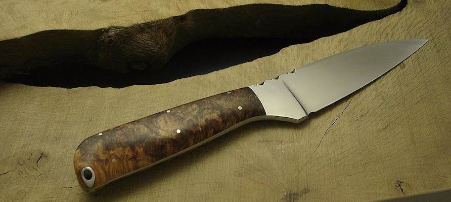 RWL34 çelik (tüm çalışmalarımı hassas ısı kontrollü ısıl işlem fırınımda sertleştiriyorum, çalışmalarımın detayları oldukça uzun bir ayrı konu olabilir ileride). Akçaağaç yumrusu kabza. Bıçak sırtında eğe işlemesi görülebilir...